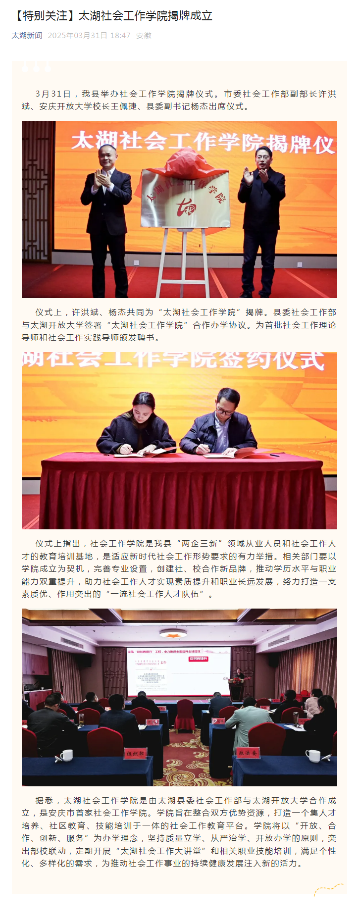 太湖新闻:太湖社会工作学院揭牌成立