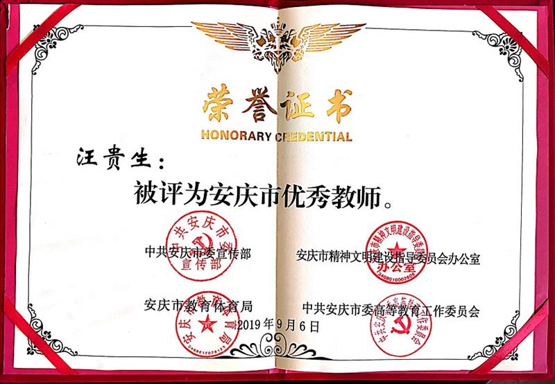 安博站·官方版网站登录入口汪贵生老师荣获2019年度“安庆市优秀教师”称号