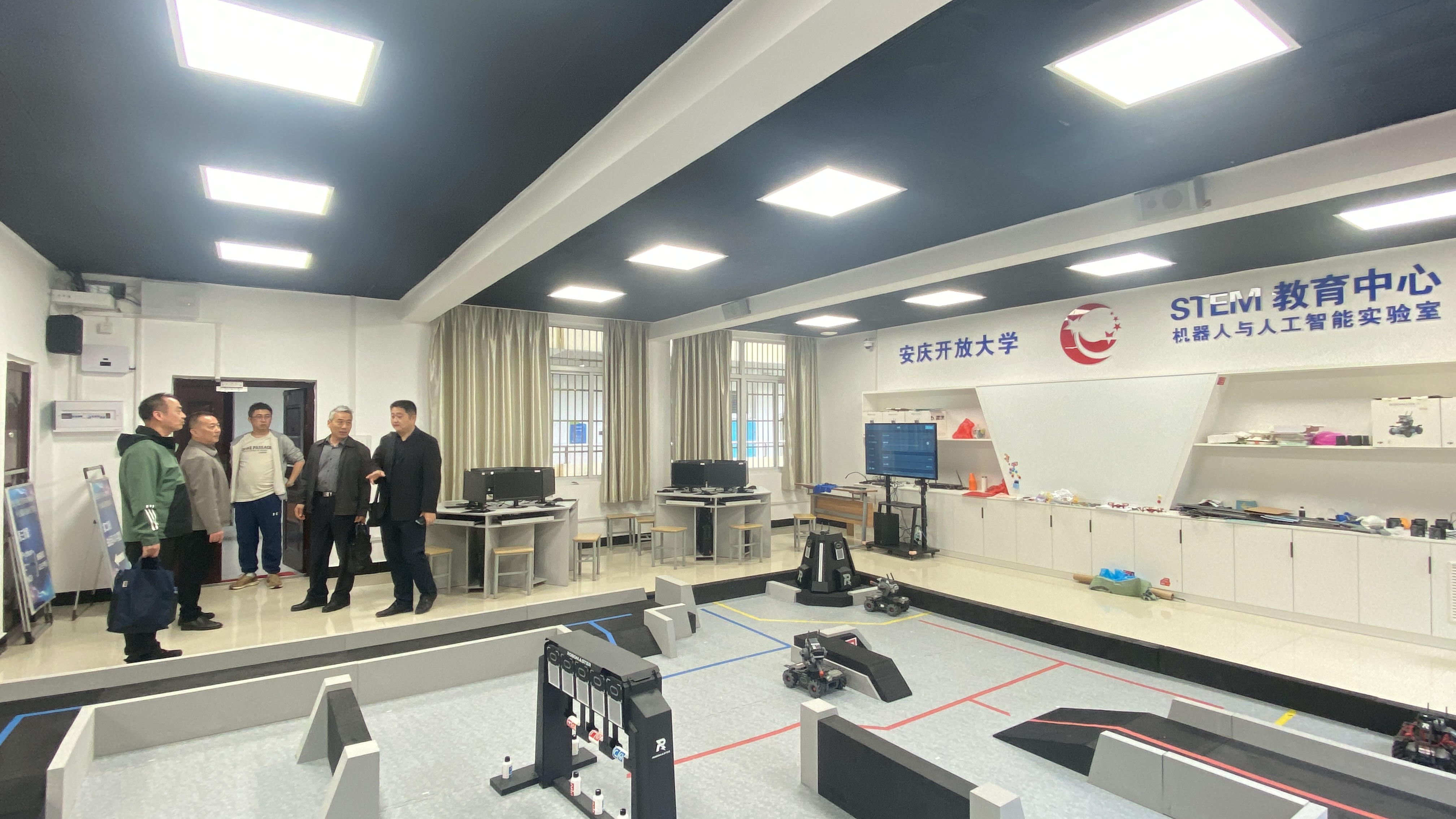 座谈会后,樊秀龙一行参观了安博站·官方版网站登录入口STEM教育中心机器人与人工智能实验室、普通话测试中心和录直播教室等教育教学服务设施。