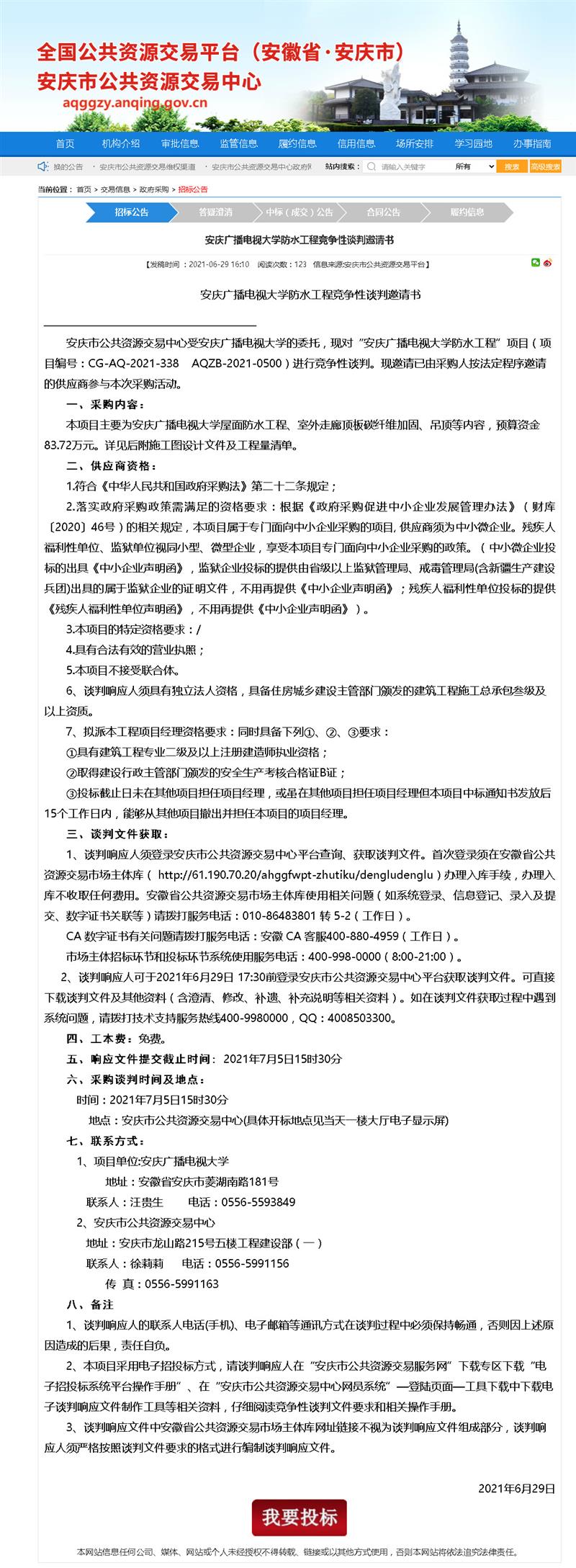 安庆广播电视大学防水工程竞争性谈判邀请书