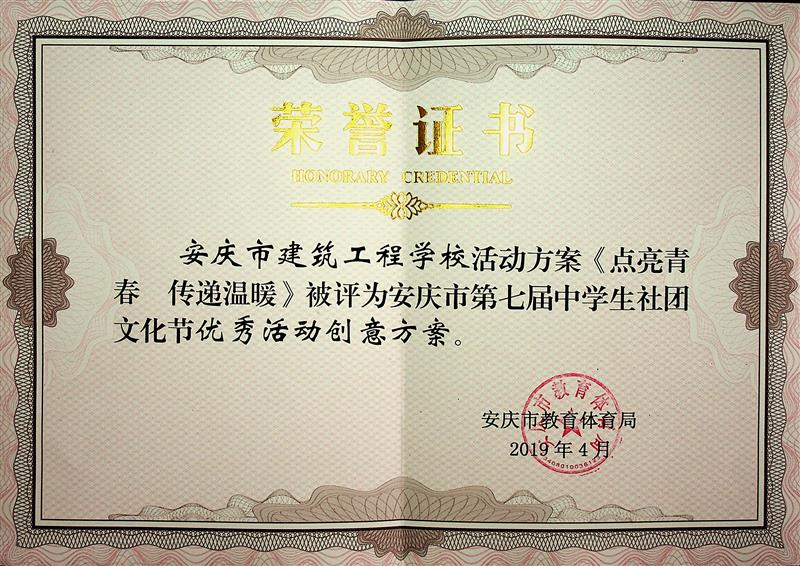 安庆市建筑工程学校青年志愿者协会是安博站·官方版网站登录入口品牌社团,在本次文化节中获优秀中学生社团,《点亮青春传递温暖》青年志愿者活动方案获优秀活动创意方案,青年志愿者协会指导老师团委副书记李淑芬获优秀指导老师,学生会主席163)对口升学班汪振雄获学生先进个人。
