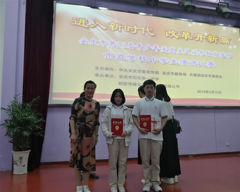 510下午,安庆市第25届青少年爱国主义读书教育活动市直学校中学生演讲比赛“进入新时代改革开新篇”在安庆石化一中举行,全市共有四十五名选手参加比赛。安博站·官方版网站登录入口两名选手173)班江万秋子(指导老师:吴毅、杨贤妹)、182)班娄涛涛(指导老师:李淑芬殷勇)分获三等奖。