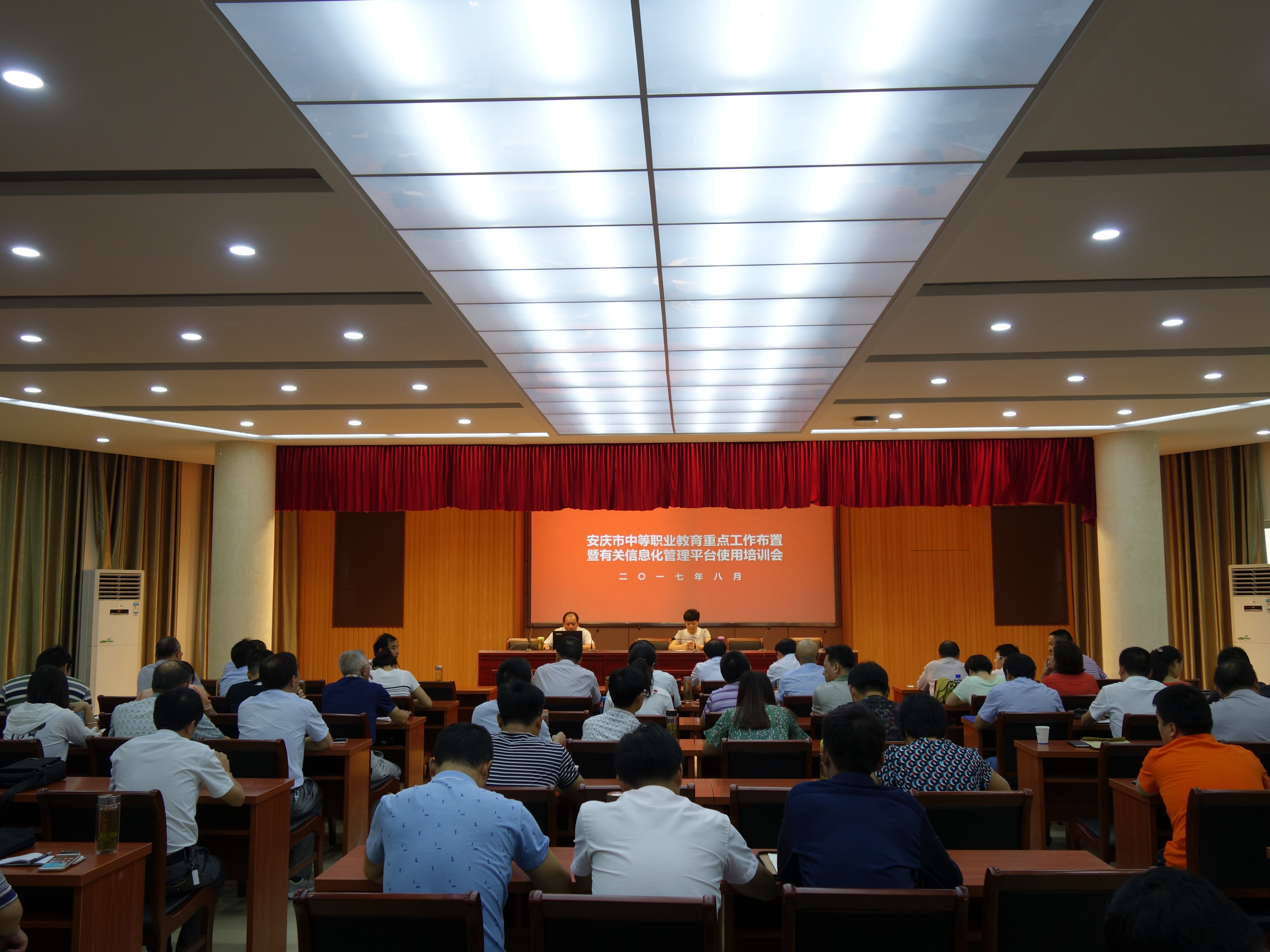8月15日上午,安庆市中等职业教育重点工作布置暨有关信息化管理平台使用培训会在安博站·官方版网站登录入口召开。会议由市教体局职成教科科长吴葵阳主持,各县(市)教育局职成教科长和全市中职学校校长、质量提升工程负责人、学籍管理员和信息平台管理员共100余人参加会议。