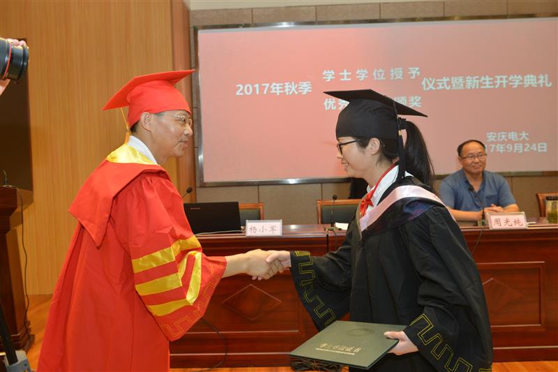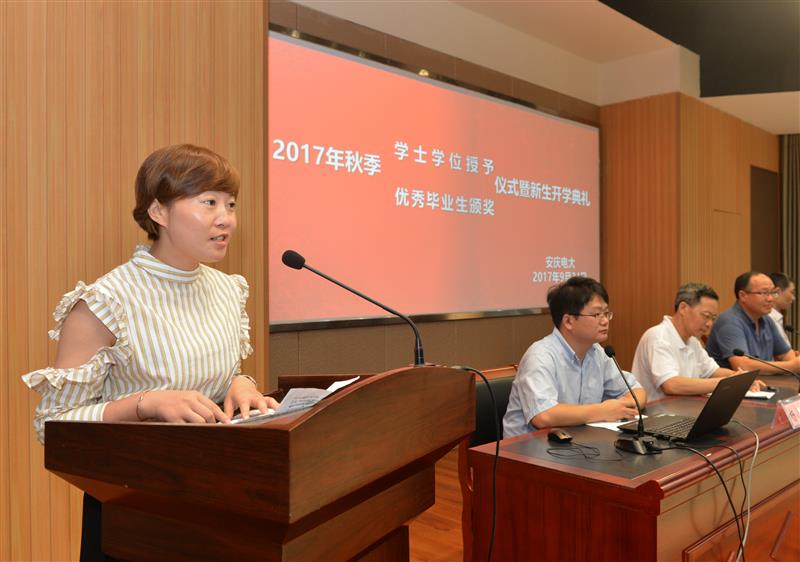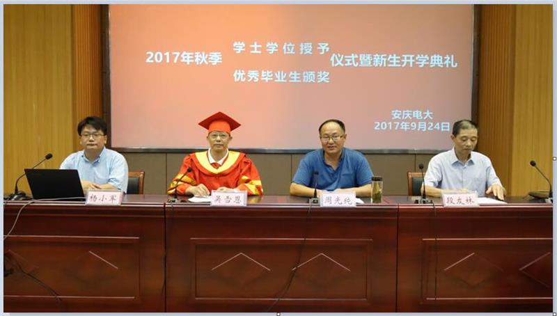 9月24日,在全市共创文明城、喜迎十九大之际,安博站·官方版网站登录入口隆重举行了开放教育2017年秋季学士学位授予仪式、优秀毕业生颁奖仪式暨开放教育新生开学典礼。校党委书记、校长吴雪恩,副校长周光纯,教务处主任段友林,开放教育处主要负责人杨小军出席,相关处室工作人员、各新生专业辅导员和获得学士学位与2016年度优秀毕业生荣誉称号的学员、近800名市直新生参加了典礼。会议由副校长周光纯主持。会议采用校园网络系统现场直播方式进行,主会场设在C楼205报告厅,7个分会场设在各班教室。