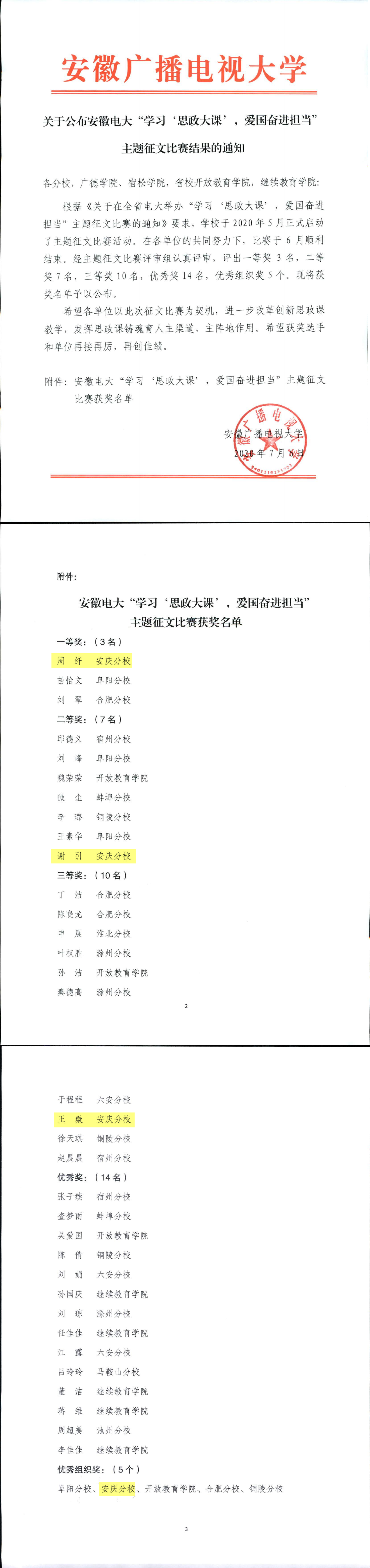 在刚刚结束的安徽电大“学习'思政大课',爱国奋进担当”主题征文比赛中,安博站·官方版网站登录入口周纤同学荣获一等奖,谢引同学获二等奖,王璇同学获三等奖。学校获优秀组织奖。