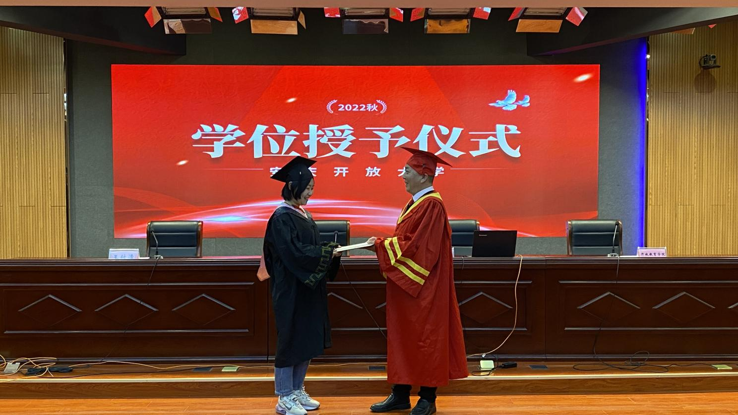 开学典礼首先在庄严的国歌声中拉开帷幕。随后进行的学位授予仪式,由王付清宣读当季获得国家开放大学学士学位的学员名单,曹劲松向到场的学位获得者依次颁发学位证书并为学员拨穗,学员们身着学士服,满怀着激动的心情纷纷合影留念。