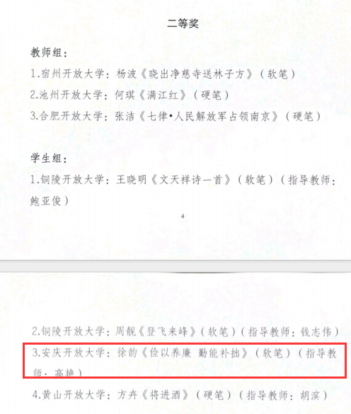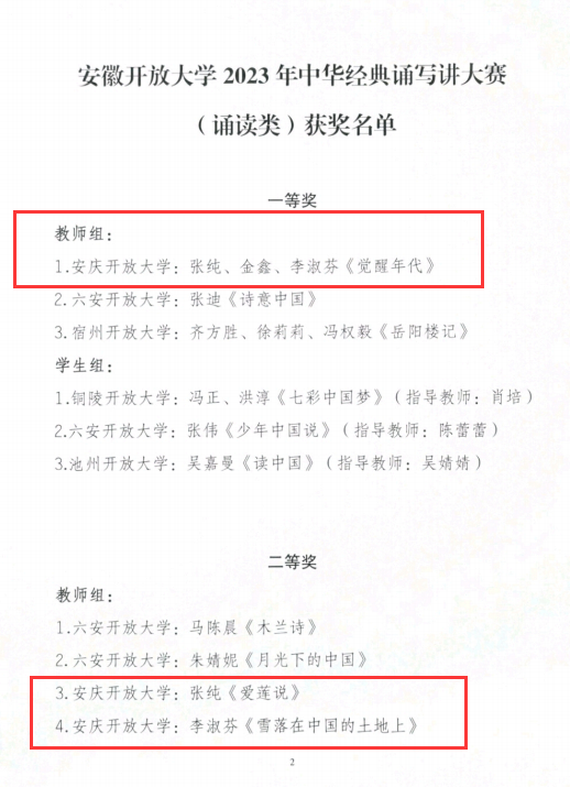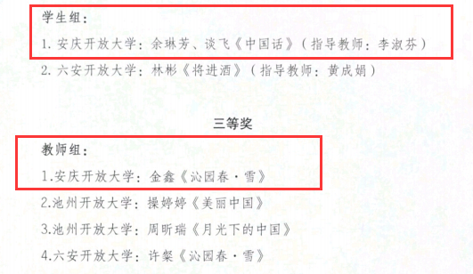 近日从省校获悉,安博站·官方版网站登录入口师生在安徽开放大学组织的2023年中华经典诵写讲大赛中,以优异成绩再创新绩:其中获一等奖作品2个、二等奖作品4个、三等奖作品2个,安庆分校也在师生的积极参与和共同努力下,获评优秀组织奖。