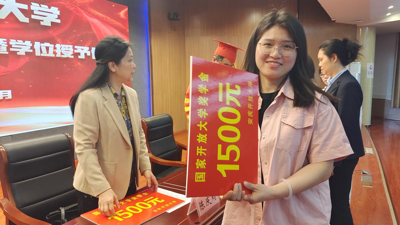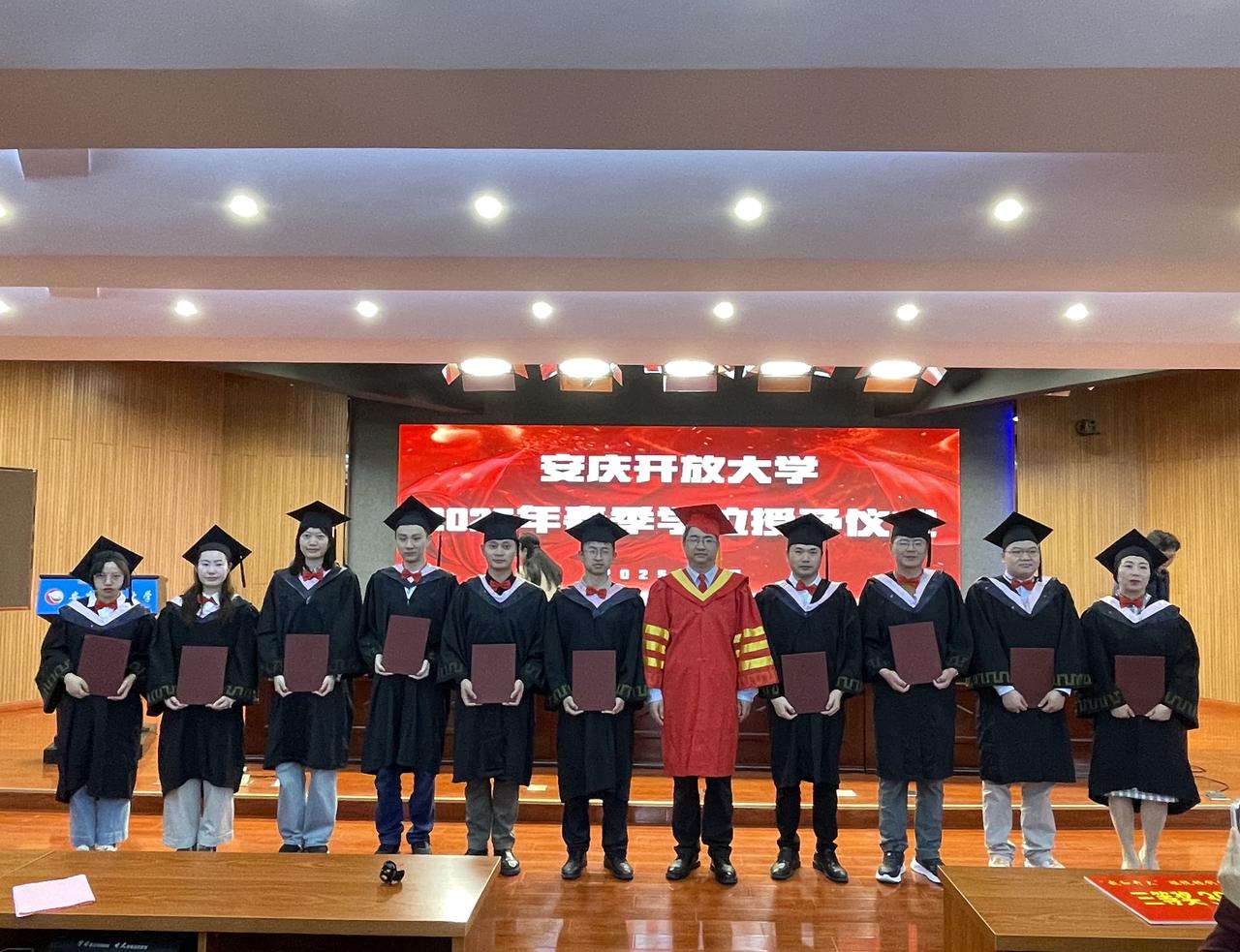 仪式中,校领导为获得国家开放大学、安徽开放大学奖学金及安博站·官方版网站登录入口第二届短视频大赛优胜奖的学生颁奖,王佩捷为2024年秋季学期获得国家开放大学学士学位的学生代表授予学位并合影留念。