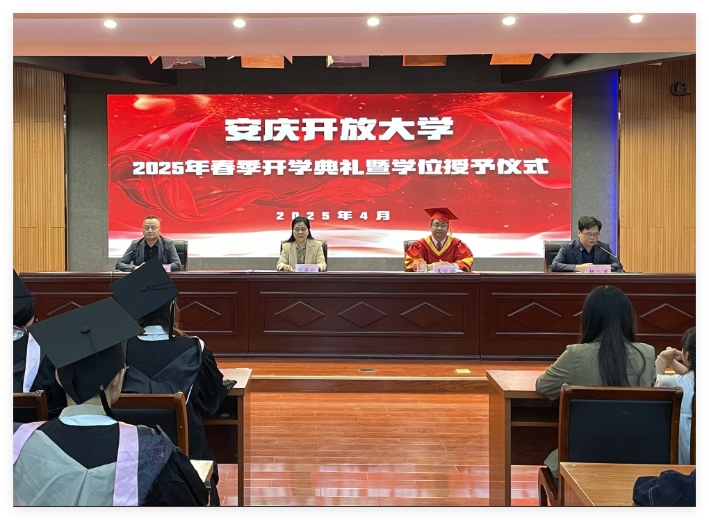 春风送暖到,正是读书时。4月26日上午,安博站·官方版网站登录入口举行了2025年春季学期开学典礼暨学位授予仪式。校党委书记陈庆玲出席仪式并讲话,校党委副书记、校长王佩捷,校党委委员、副校长王付清,校相关部门负责人及获奖学生代表、获得学位的学生代表等50余人参加了现场活动,仪式全程通过“安庆开大”微信公众号向学校及所辖六县(市)开放大学学生直播。