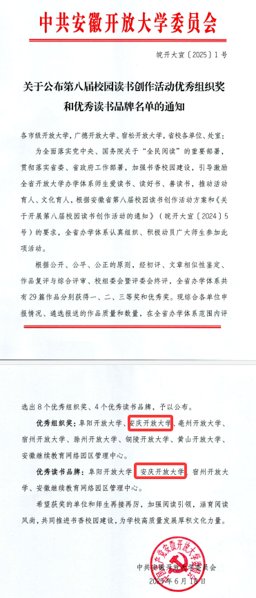 近日,安徽开放大学发布《关于公布第八届校园读书创作活动优秀组织奖和优秀读书品牌名单的通知》,安庆开大以优异成绩获得“优秀组织奖”和“优秀读书品牌”双荣誉。
