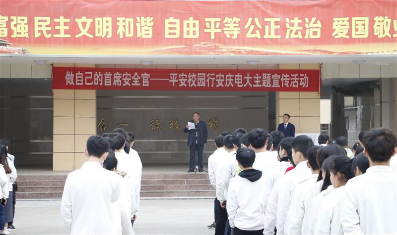 仪式上,副校长周光纯代表学校宣布:安庆电大“平安校园行”主题宣传活动正式启动。他指出,3月26日,是第23个全国中小学生安全教育日。根据教育部的统一部署,从即日起到年底,面向中小学校和幻儿园,组织开展“做自己的首席安全官—平安校园行”主题宣传活动,旨在通过校园安全教育,进一步提升全体师生安全法治意识,切实增强安全防范意识,不断提高自我保护能力。他希望,全体师生积极投身“做自己的首席安全官—平安校园行”主题宣传活动,他要求全体班级干部、团委干部和全体青年志愿者在活动中起先锋模范带头作用。他相信,有全体师生的共同努力,一定会把我们的校园建成最阳光、最安全的地方。