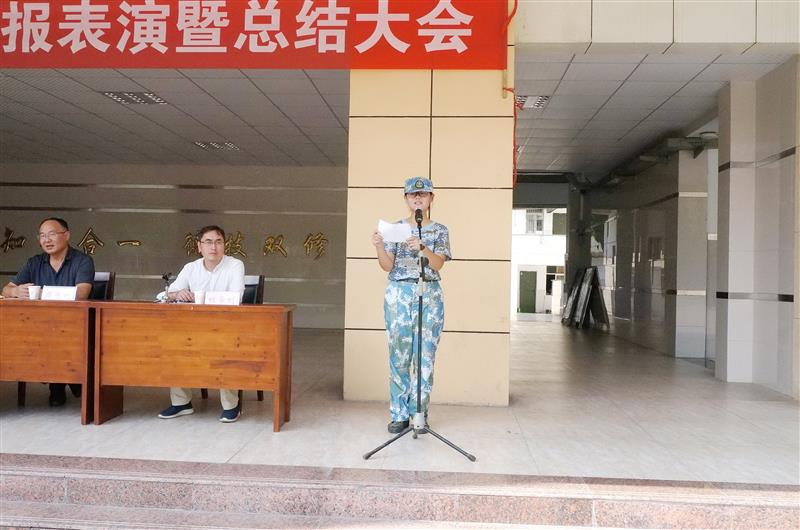 96日下午,2019级新生军训汇报表演暨总结大会在校操场顺利举行。校党委委员、副校长周光纯,迎江区武装部政工科科长刘小磊、职成处主任程学刚、保卫处主任庞涛以及各班班主任等参加大会。大会由职成处主任程学刚主持。