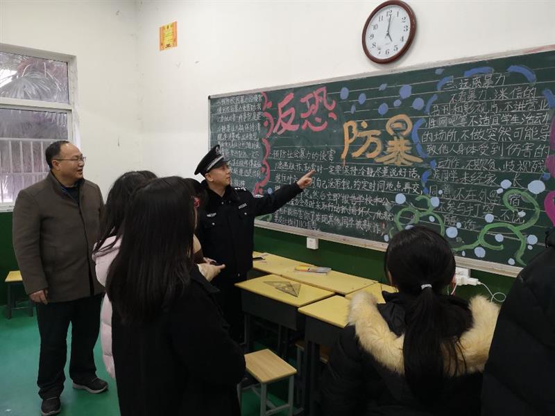 会议后沈警官深入教室查看了同学们制作的主题板报,指导学生在面对暴恐势力进入校园教室袭击师生时如何进行防范和自救。