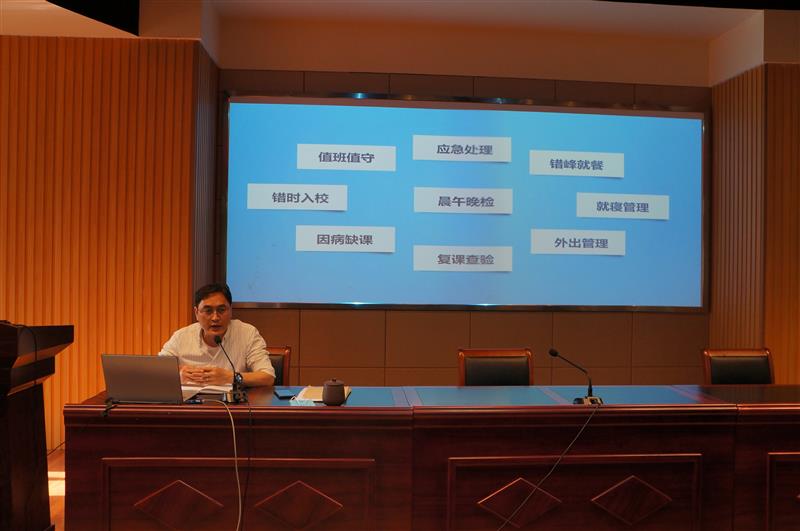 接着,程学刚主任分别从值班值守、错时入校、因病缺课、晨午晚检、复课自检、应急处理、错峰就餐、就寝管理、外出管理九个方面详细的向班主任介绍复学工作具体要求。