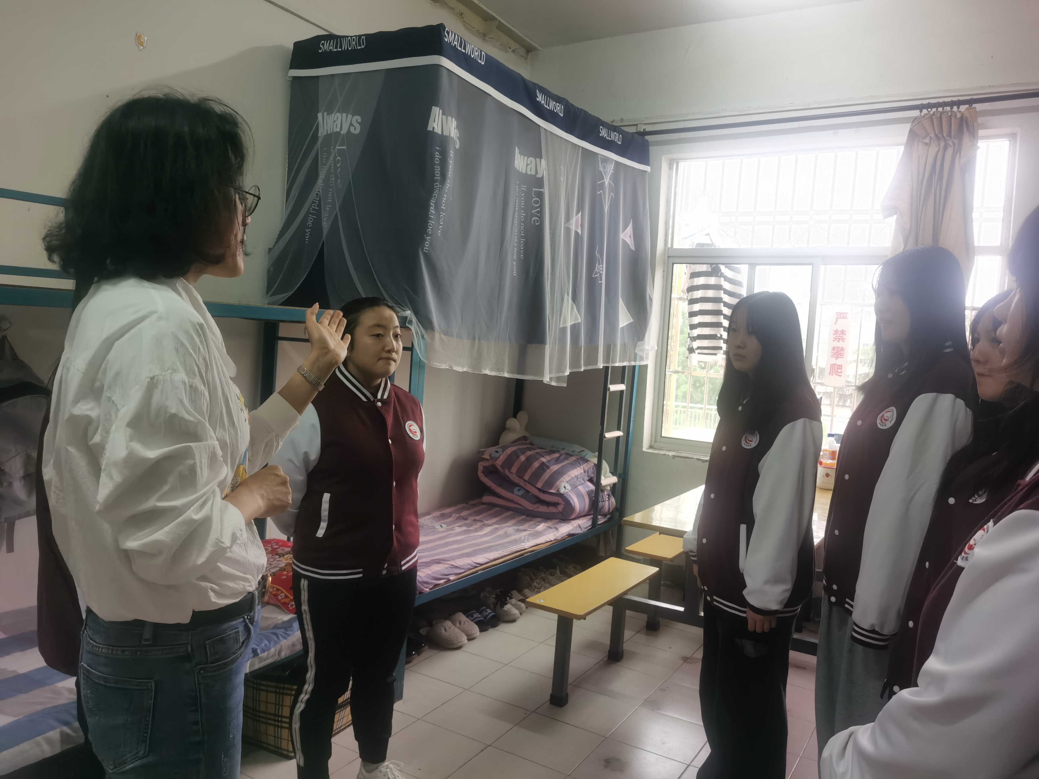 本次针对女生宿舍卫生、违禁物品进行了细致的检查,并对在检查中出现的问题进行了批评与指导。很多宿舍总体效果不错,干净整洁,床铺上物品及其他生活用品摆放整齐,能给人一种温馨怡人的感觉。在宿舍里,李淑芬对学生内务要求做了详细说明,从整理床铺、叠放衣物到摆放牙具和各类生活用品都一一展示,并在整理的过程中耐心向同学们讲解物品的整理方法和要求。同时,带领全体委员到优秀寝室进行参观。