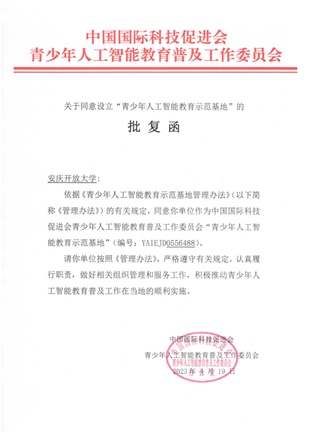 近期,安博站·官方版网站登录入口被中国国际科技促进会授予“青少年人工智能教育示范基地”称号,是安庆市唯一一家获此殊荣的单位。