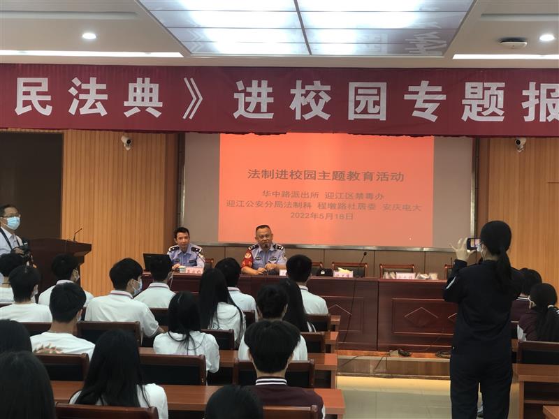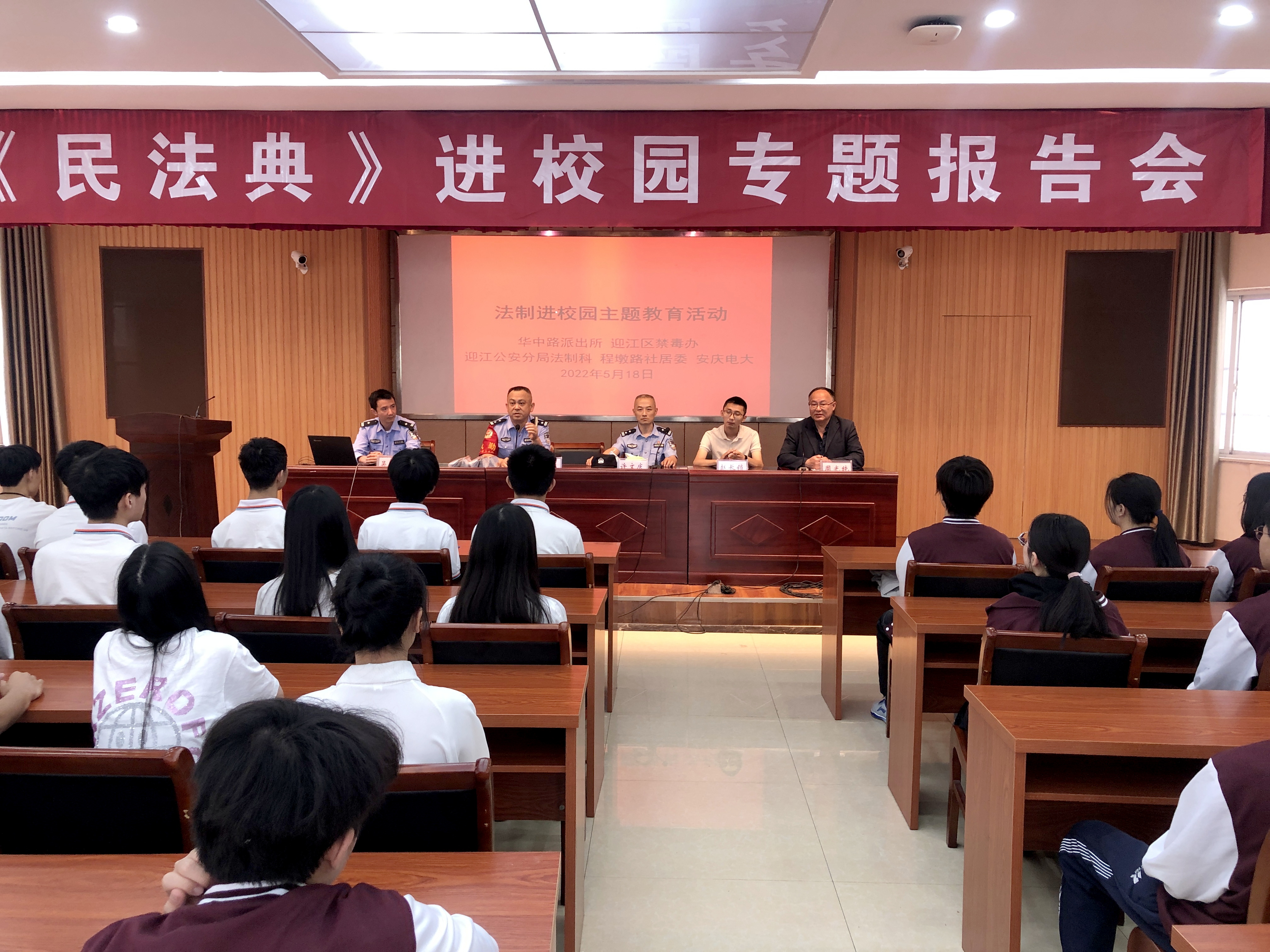 为进一步弘扬法治精神,提升学生法治意识,切实做好青少年《民法典》学习教育,5月18日上午,安博站·官方版网站登录入口与华中路派出所、迎江公安分局法制科、迎江区禁毒办、程墩路社居委联合举办“法治进校园主题教育活动”。华中路派出所教导员马忠东、迎江区禁毒办主任许文庆、迎江公安分局法制科副科长吴承钧、程墩路社居委副书记赵长锁,报告会由副校长周光纯主持。