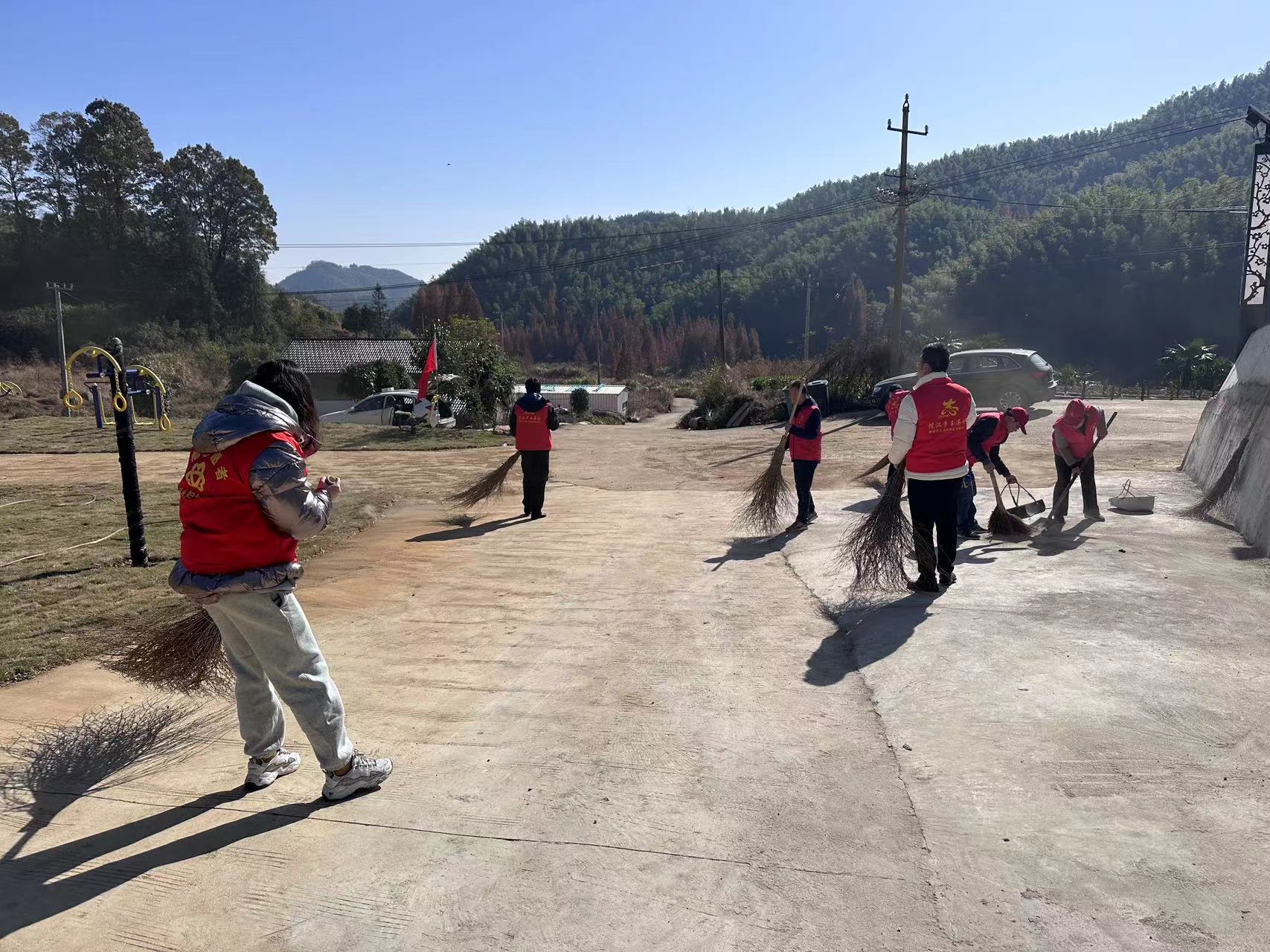 地处玉屏村高山深处的蒋弯村民组健身广场新近竣工不久,附近堆砌有不少的建筑垃圾和农户的生产生活垃圾。王佩捷一行身穿志愿者服装,手拿铁铲、扫把等工具,与玉屏村支两委、驻村工作队和部分群众一道,对健身广场进行了“地毯式”清扫,美丽村庄展露新颜。