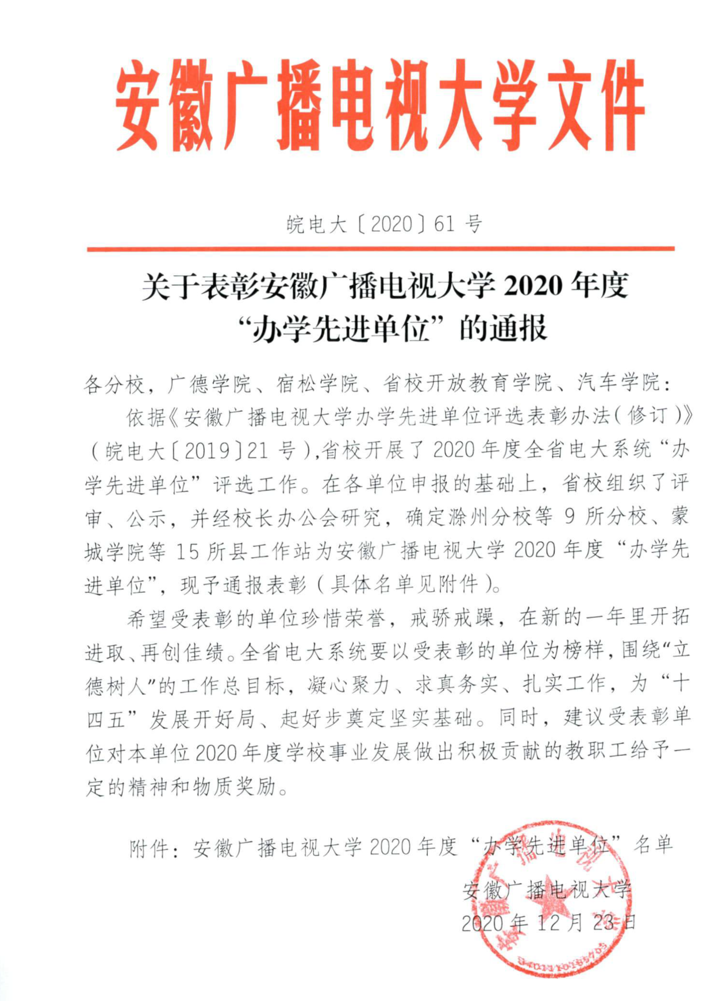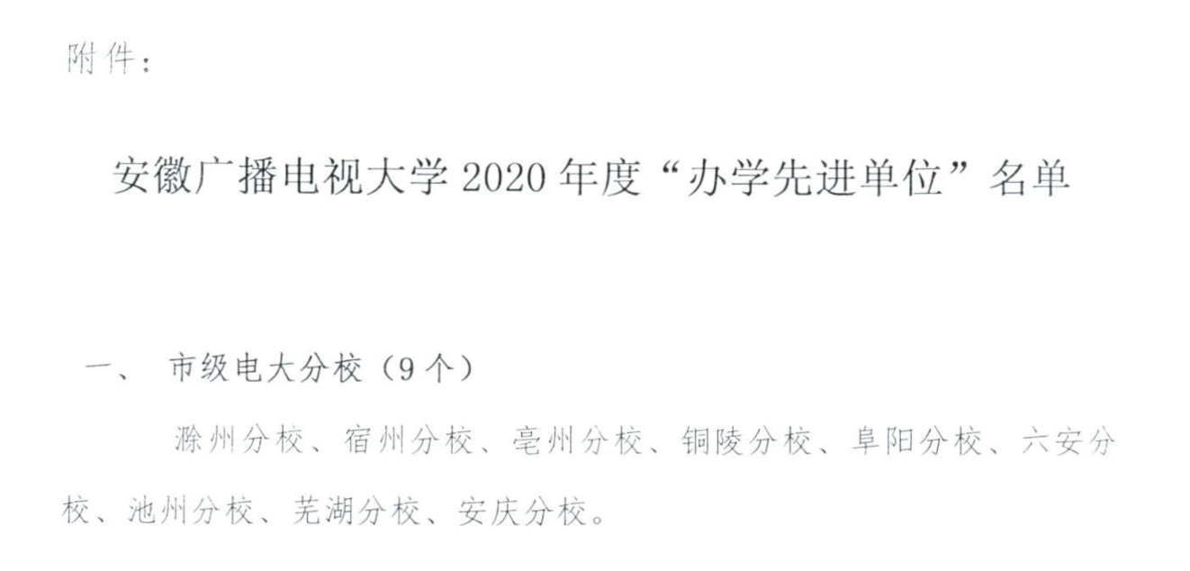 安博站·官方版网站登录入口喜获安徽广播电视大学2020年度“办学先进单位”称号