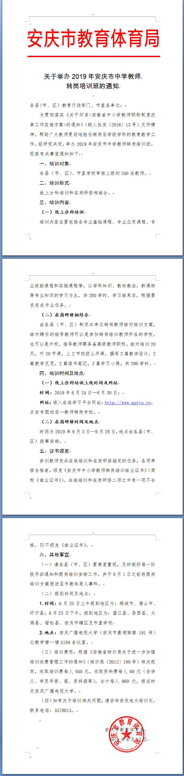 关于举办安庆市2019年教师转岗培训班通知