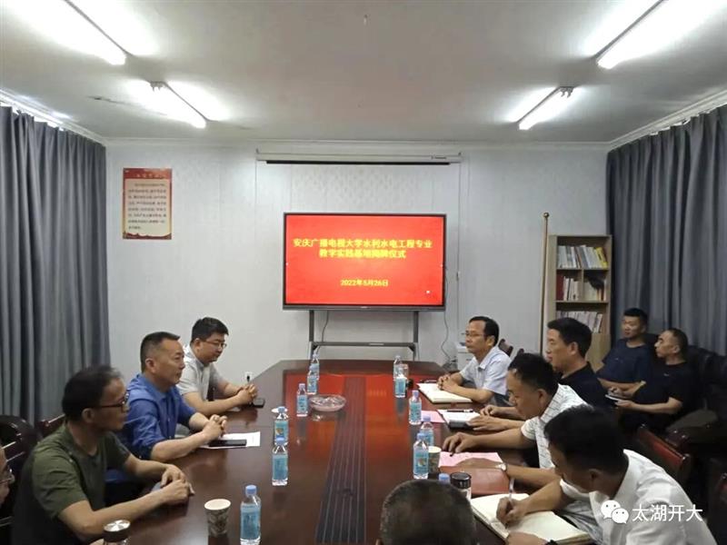 2022年5月25日下午,安庆广播电视大学、安徽广播电视大学太湖工作站开放教育本科水利水电专业教学实践基地签约授牌仪式在太湖县水利局所辖国家级水利工程管理单位太湖县方洲水库举行。安庆广播电视大学党委书记、校长曹劲松、副校长王佩捷,太湖县教育局党委委员、总督学陈佳全、太湖县水利局副局长王东贵、方洲水库管理所所长叶胜生、太湖电大副校长陈文东等出席签约仪式。陈文东同志主持了本次会议,太湖电大和方洲水库管理所全体职工参加仪式。