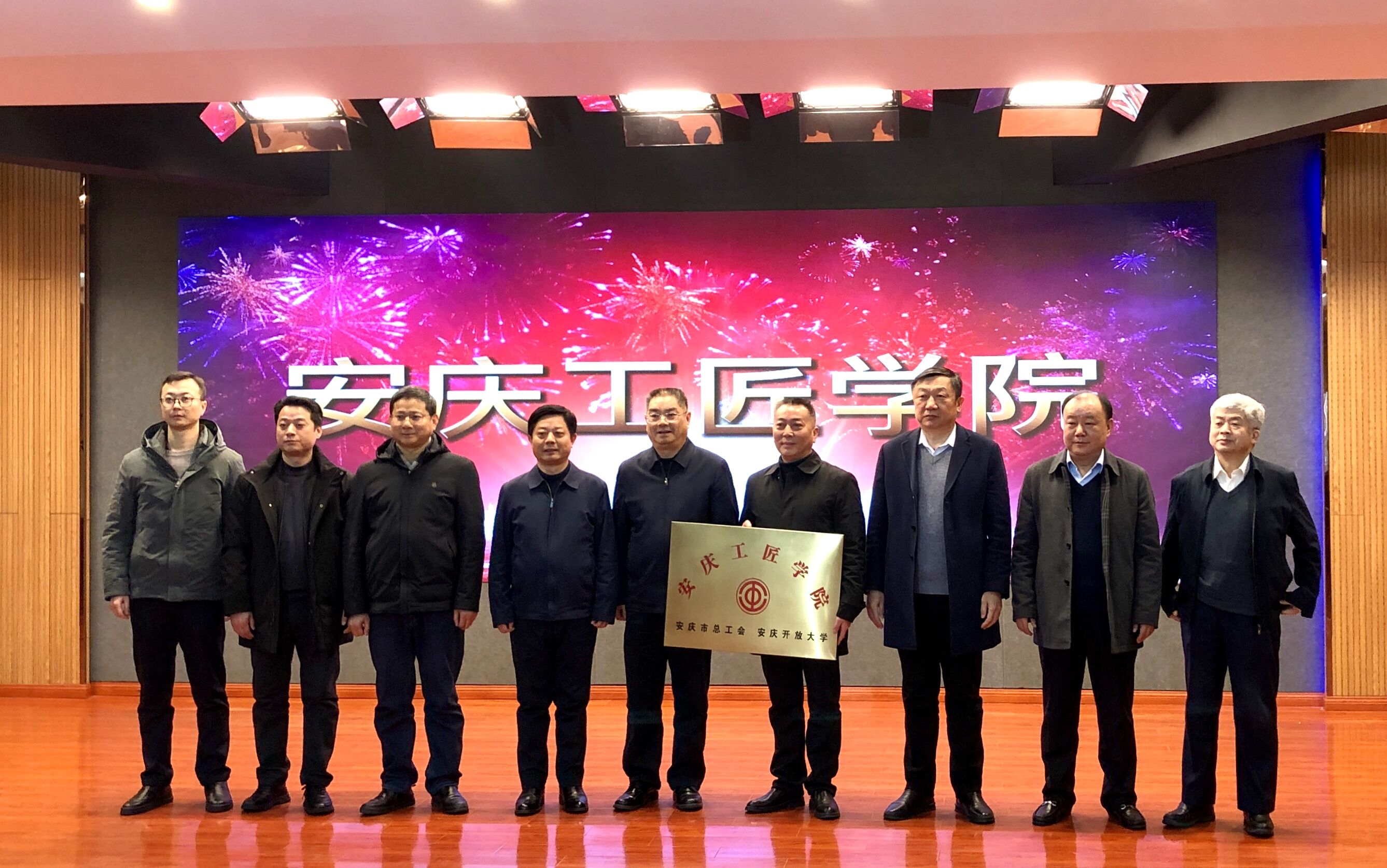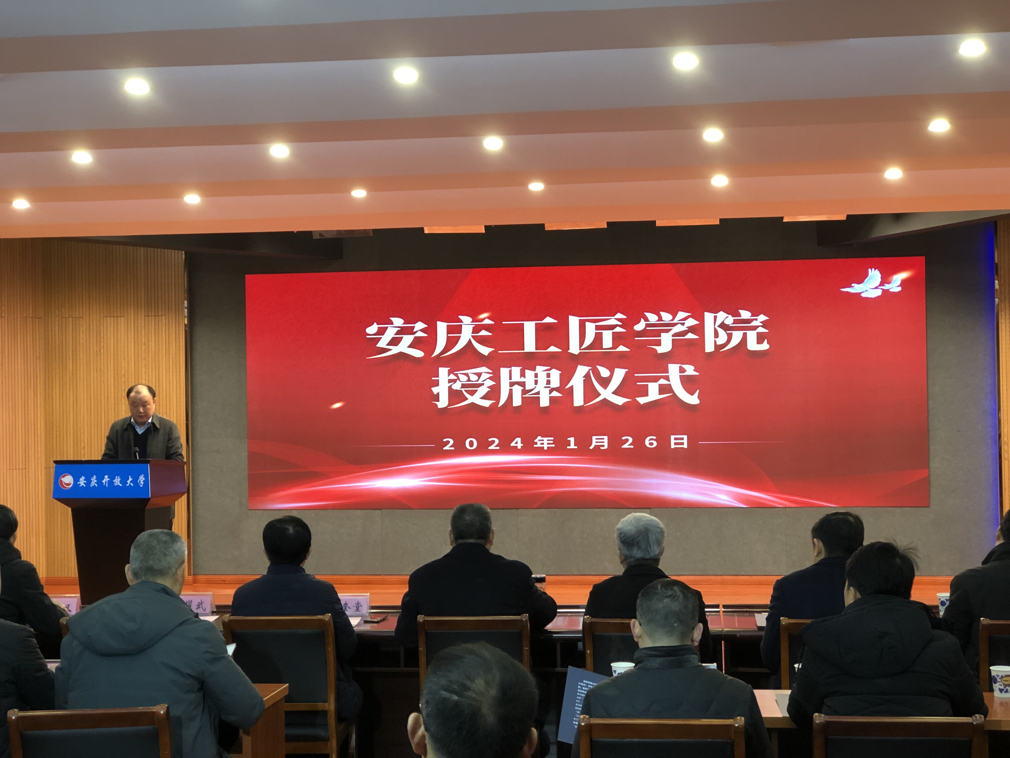 1月26日上午,安庆工匠学院授牌仪式在安博站·官方版网站登录入口举行。安徽省总工会党组成员、经审会主任曾传发,安庆市人大常委会副主任、市总工会主席姜奎堂,安庆市总工会党组书记、常务副主席王耀武,安庆市人社局党组书记、局长王志节,安庆市委教体工委副书记张复双,安庆市总工会党组成员、经审会主任阳传国,安博站·官方版网站登录入口党委书记、校长曹劲松,安博站·官方版网站登录入口党委委员、副校长王付清出席仪式。省、市总工会相关部门的领导、安博站·官方版网站登录入口师生代表和新闻媒体的朋友们参加了授牌仪式。