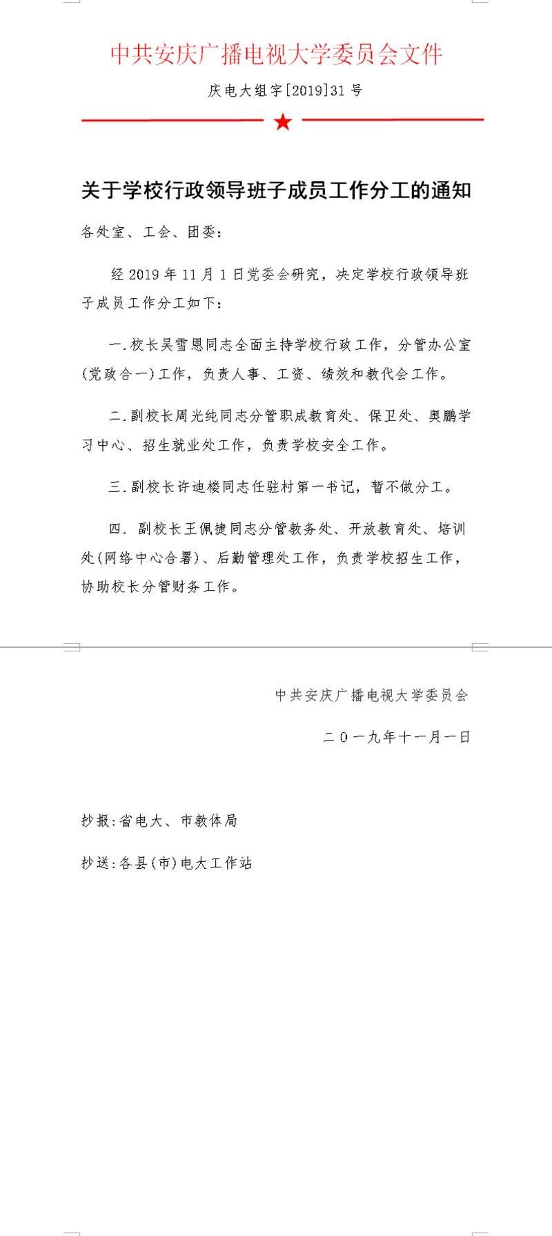 关于学校行政领导班子成员工作分工的通知