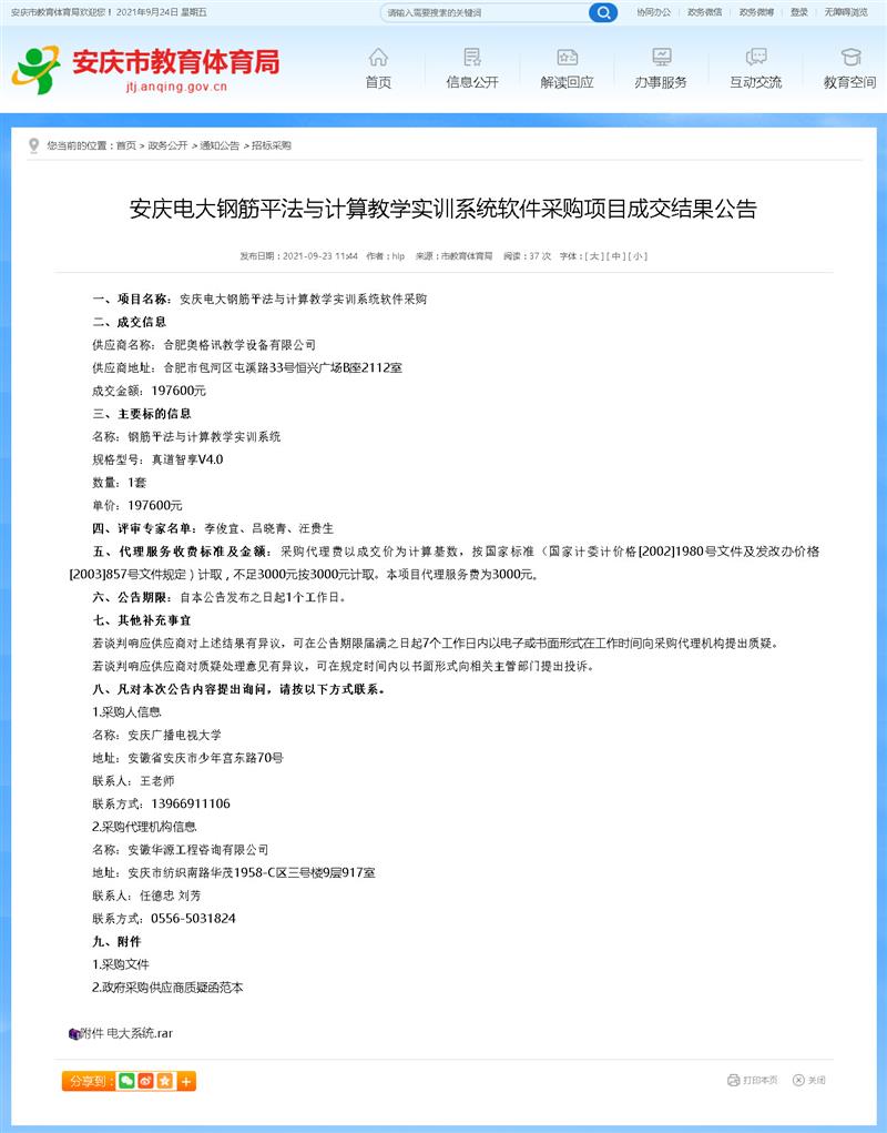 安庆电大钢筋平法与计算教学实训系统软件采购项目成交结果公告
