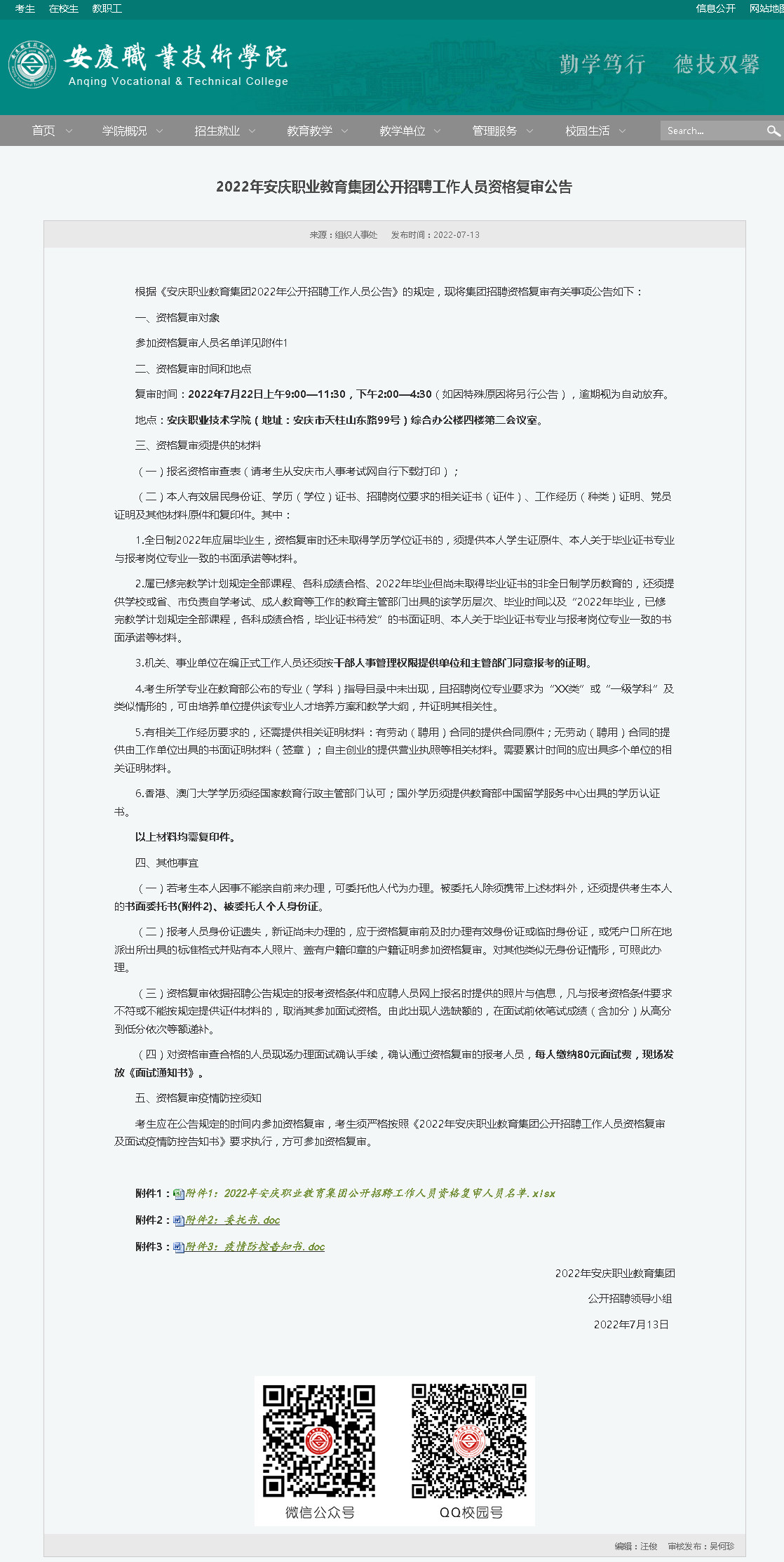2022年安庆职业教育集团公开招聘工作人员资格复审公告