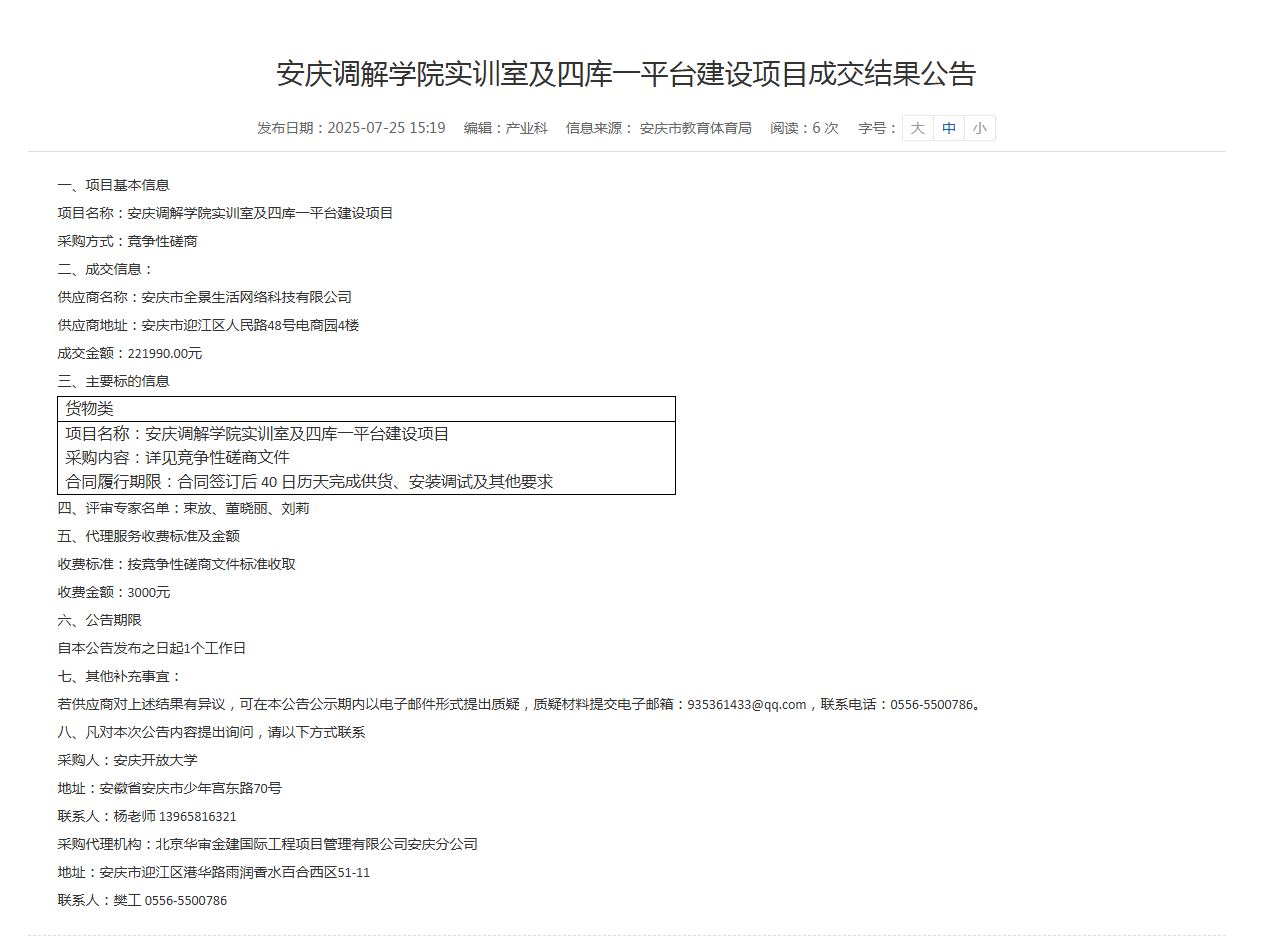 安庆调解学院实训室及四库一平台建设项目成交结果公告
