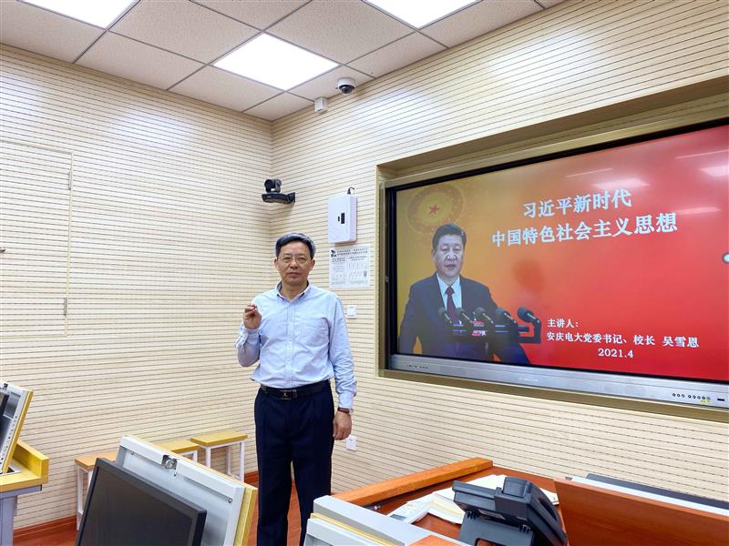 4月29日晚,党委书记、校长吴雪恩走进网络直播教室,为学生在线讲授《习近平新时代中国特色社会主义思想》。