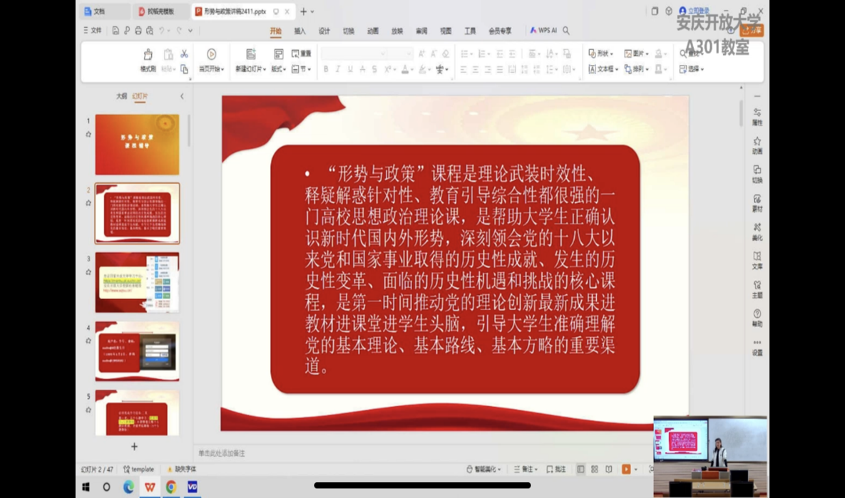 为扎实推进学校思政课建设,提高思政课教学质量。11月18日晚,校党委副书记、校长王佩捷、全体专、兼职教师和开放教育各专业学生共同听取了李玲老师的线上思政课《形势与政策》。课上,李玲老师以文化自信——习近平文化思想的原创性贡献为主题,以历史自信与文化自信、文明自信的统一为切入点,引导学生领悟文化在强国建设、民族复兴中历史根脉、文化引领、精神支撑的不可替代的重要作用。同时还详细介绍了《形势与政策》课程考核方式和完成网上形考、终考的具体要求,帮助学生熟悉操作流程,掌握学习技巧。