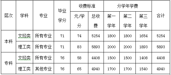 专科:文科58元/学分,总学分为76学分;理科其他专业65元/学分,总学分为76学分。