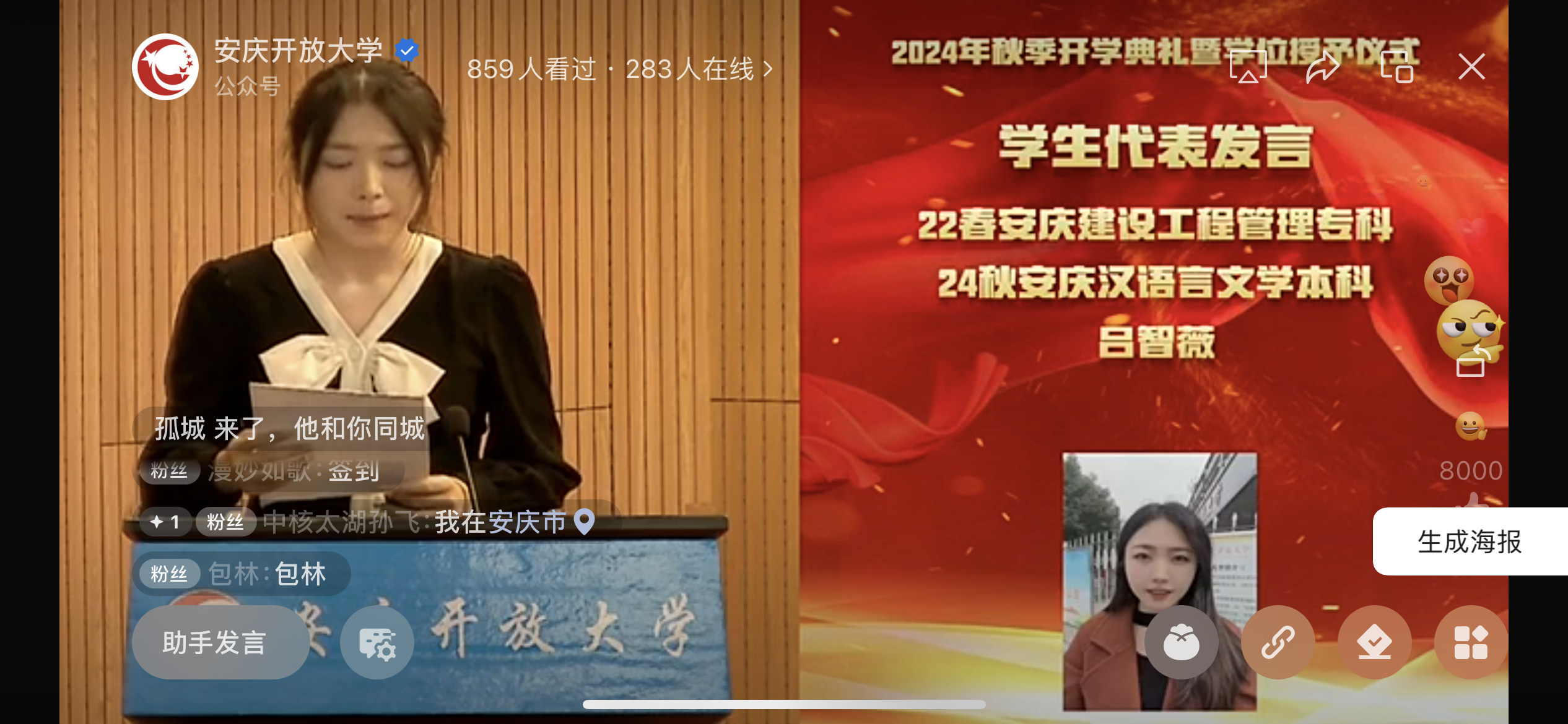 仪式后,24秋季专升本学员吕智薇作为新生代表发言,她以在安庆开大求学的亲身经历向大家分享了自己的学习经验和收获,并号召包括自己在内的所有新学员们树立学习目标和自信,在接下来的新征程中无惧无畏,奋勇前行。