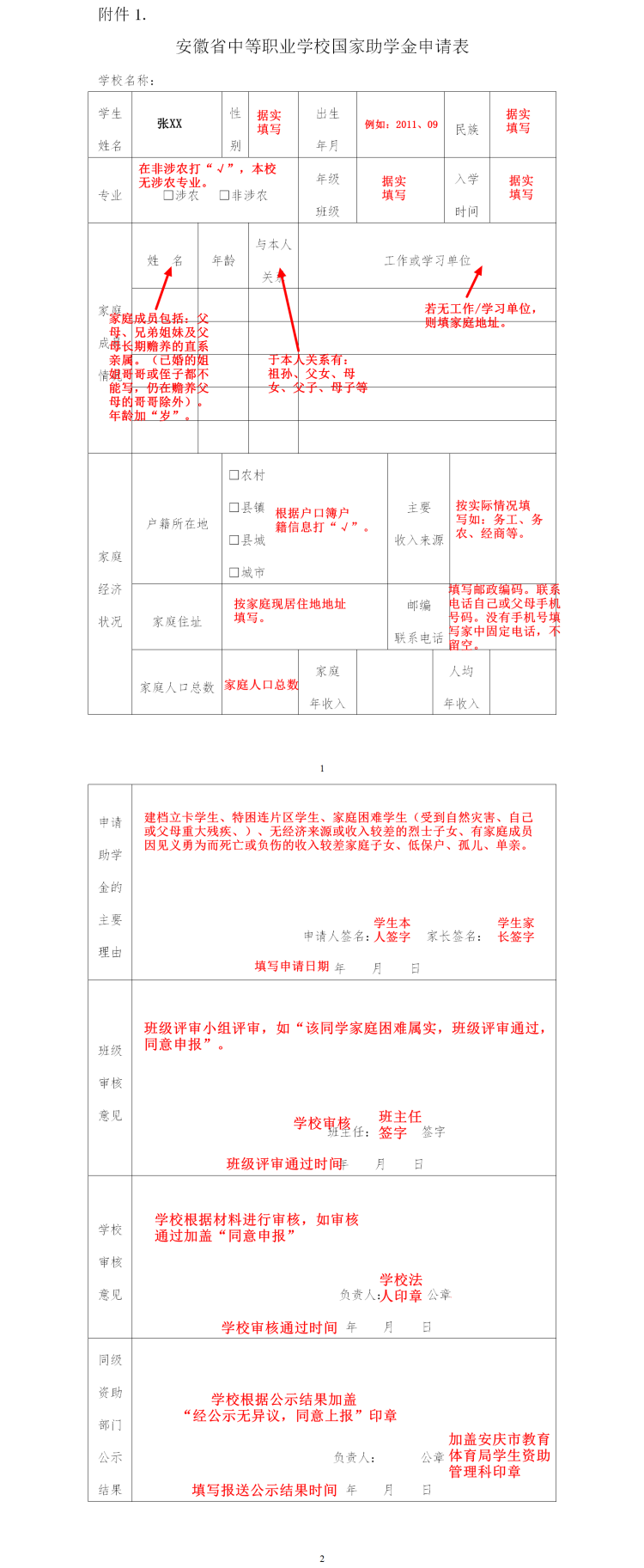 《安徽省中等职业学校国家助学金申请表》填表指南