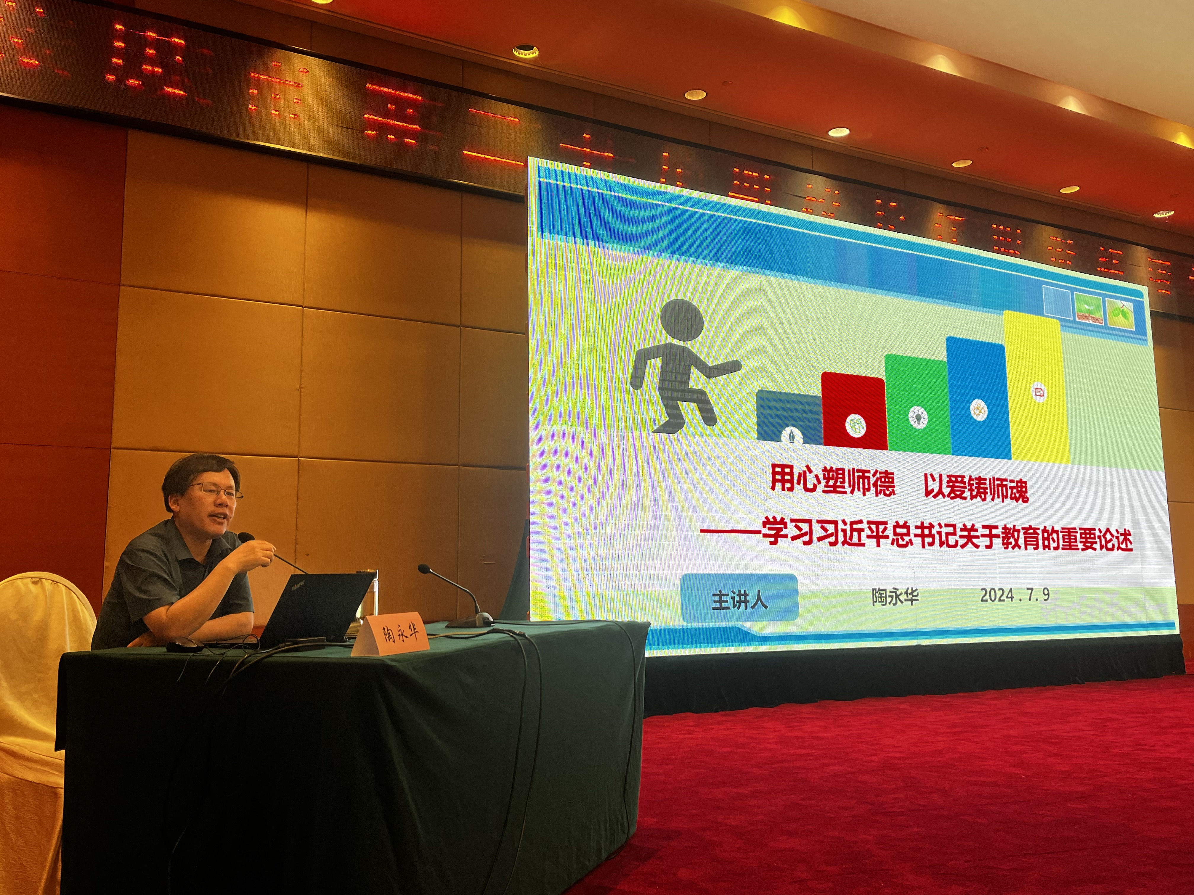 开班仪式后,安徽师范大学陶永华教授为学员们带来了题为《用心塑师德,以爱铸师魂》的专题讲座。陶教授结合习近平总书记关于教育的重要论述,深入分析了我国教育面临的内外环境变化,并就如何将总书记的宏伟蓝图转化为生动实践进行了详细阐述。