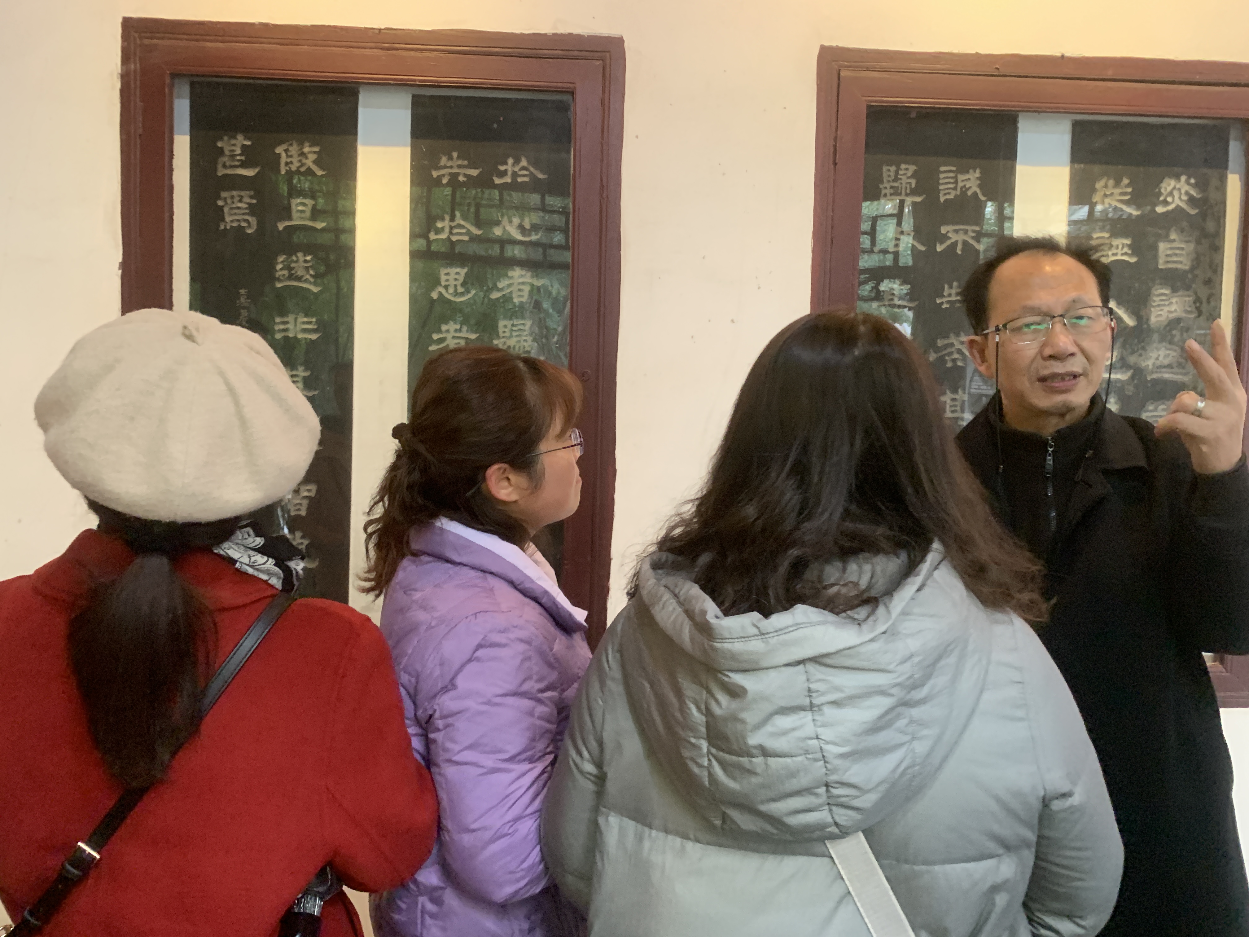 在一方方珍贵的碑刻前,王柏翠老师融合历史、人文和哲学,从字体、笔法、风格等方面细心地逐碑讲解、逐字点评。学员们则聚精会神地围绕聆听,近距离感受艺术瑰宝的魅力,体会中国书法与篆刻艺术的博大精深,更坚定了文化自信,激发了学习传承中国书法的热情和使命感。