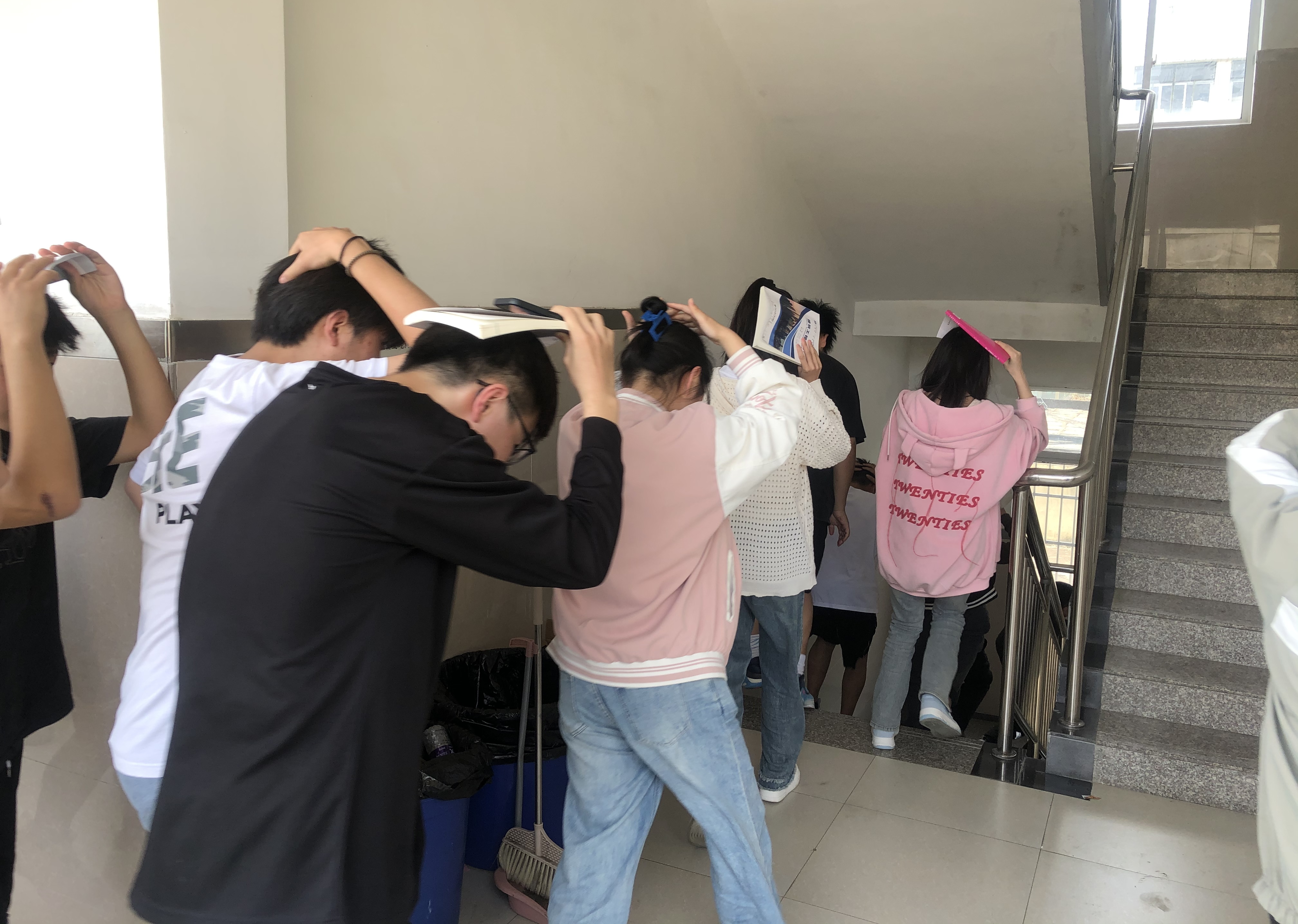 下午15时30分,随着第一声警报响起,全体同学迅速紧急避险,各班同学们双手护头,迅速在课桌(椅)旁下蹲等安全地带避险,紧接着第二声警报响起,同学们在各楼层老师的统一指挥下,分别快速成两列纵队做好防护从规定的楼道有序撤离到安全地带。