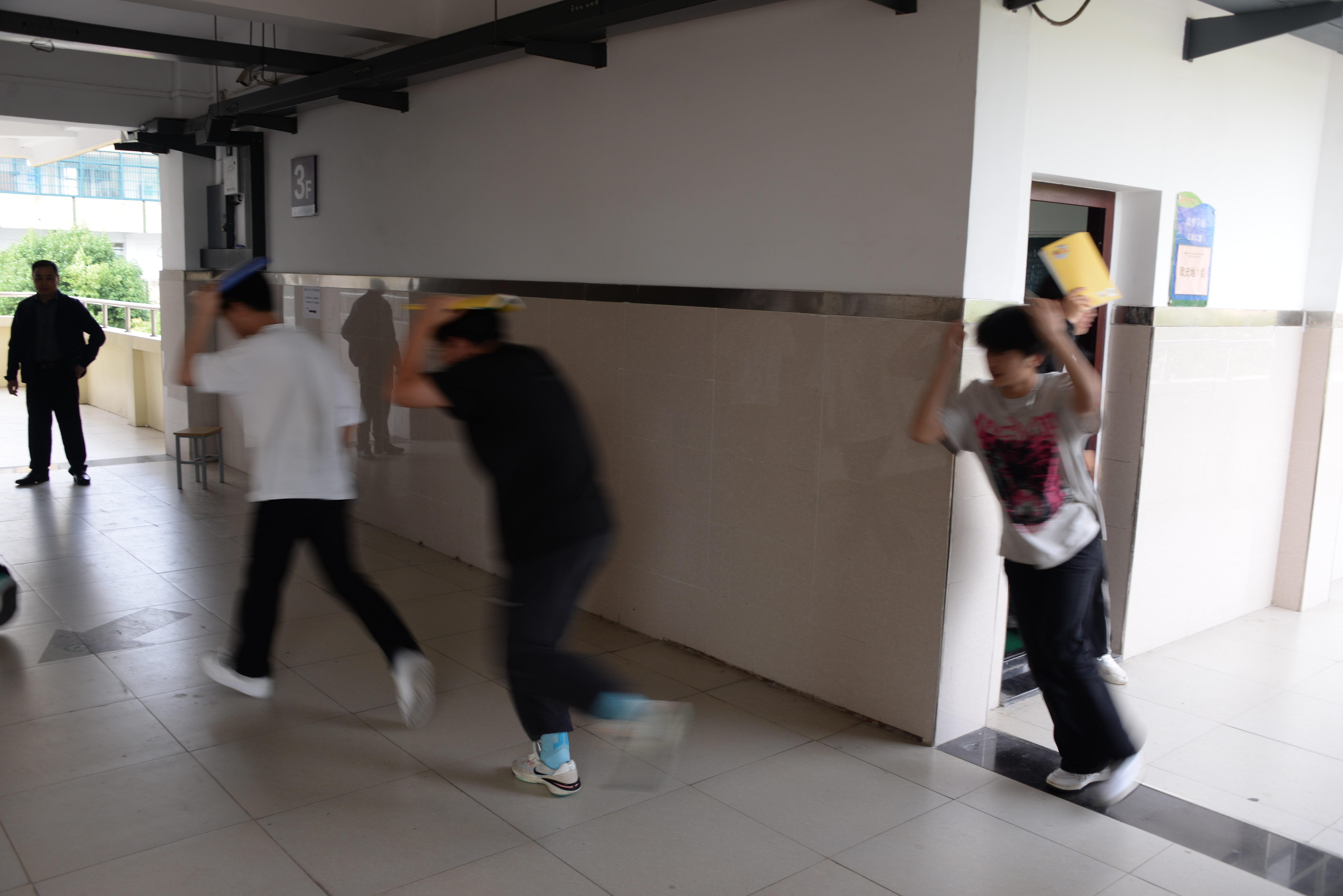 5月10日下午3:50分,随着第一声警报响起,全体同学迅速紧急避险,各班同学们双手护头,迅速在课桌(椅)旁下蹲等安全地带避险,紧接着第二声警报响起,同学们在各楼层老师的统一指挥下,分别快速成两列纵队做好防护从规定的楼道有序撤离到安全地带。