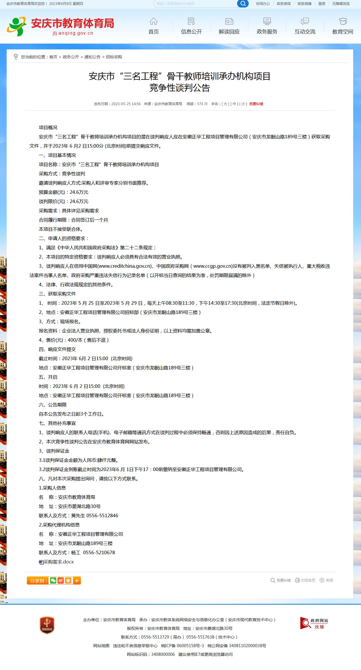 安庆市“三名工程”骨干教师培训承办机构项目 竞争性谈判公告