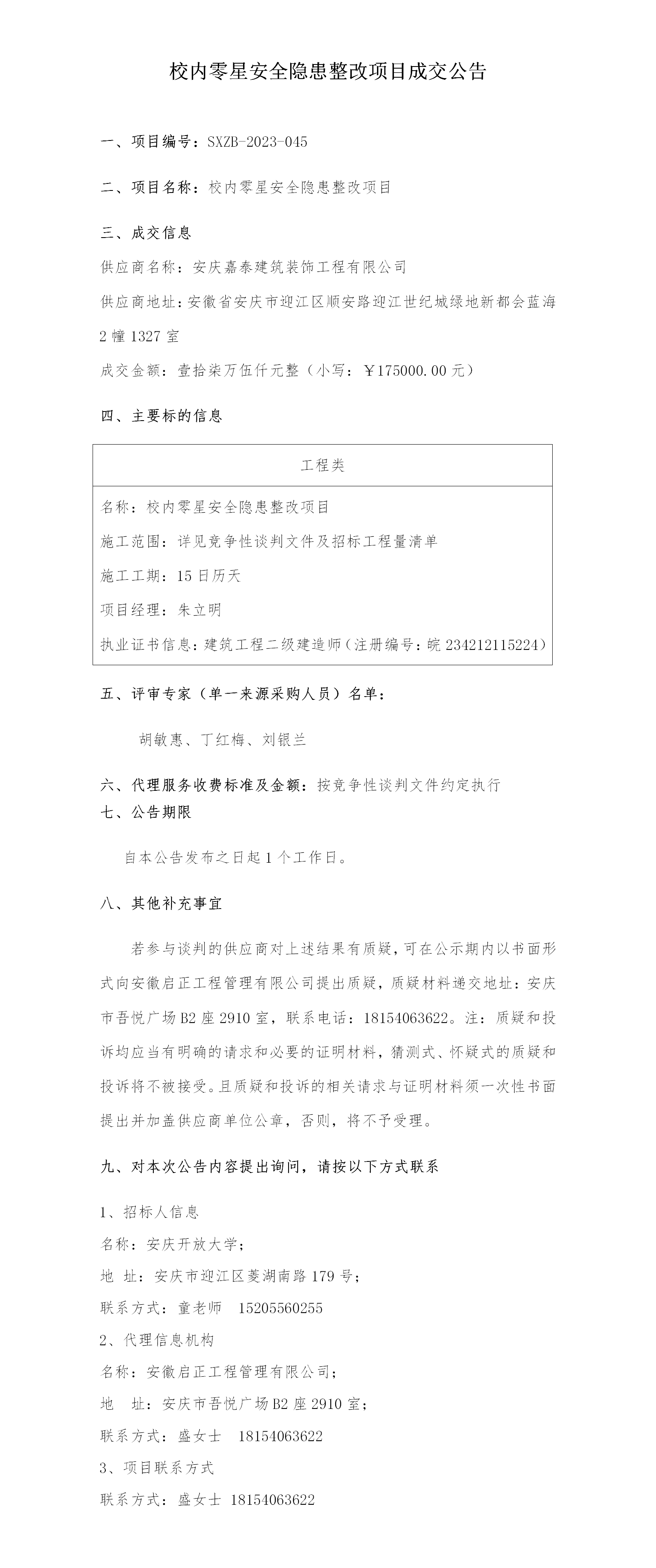 校内零星安全隐患整改项目成交公告