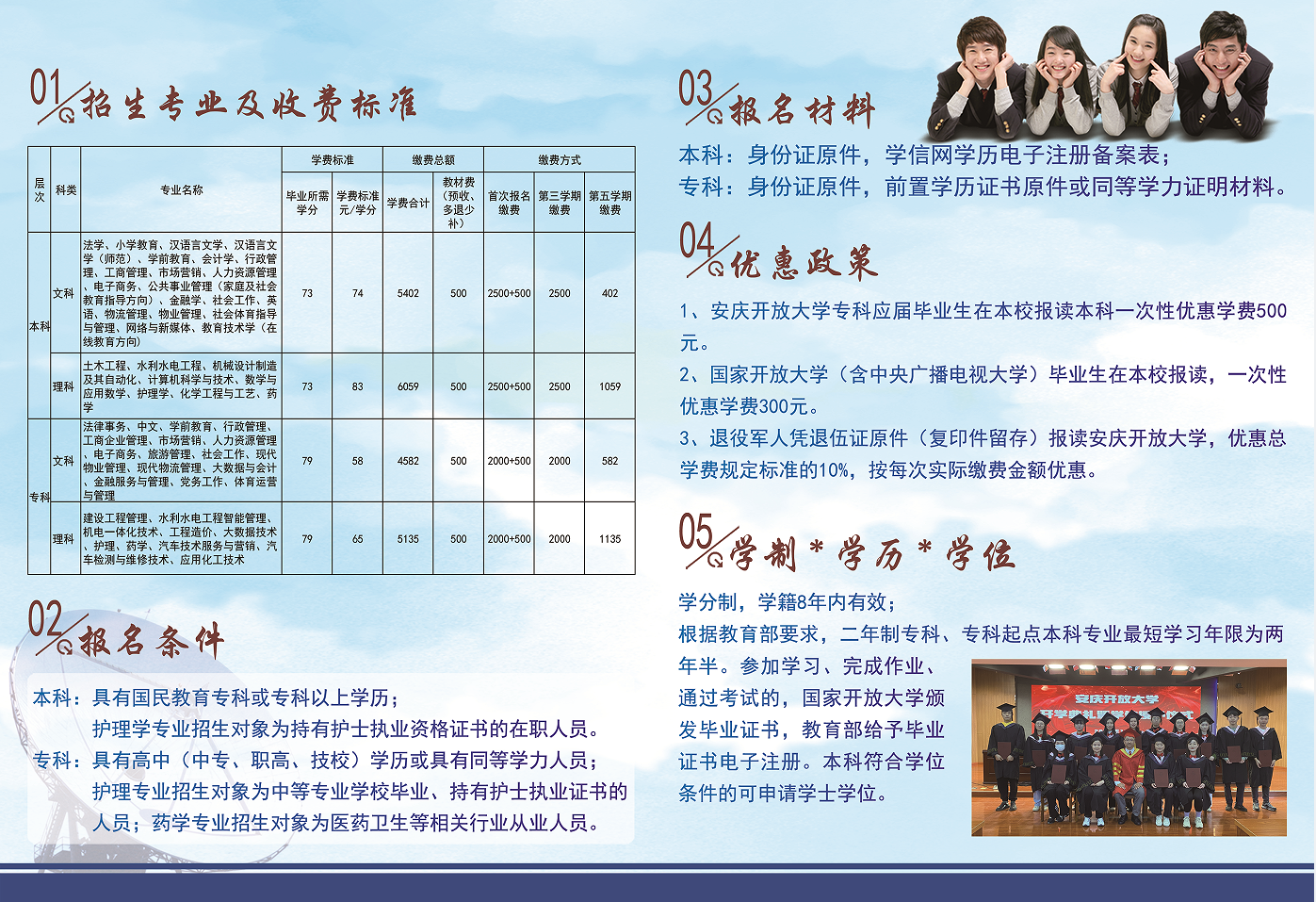 2、国家开放大学(含中央广播电视大学)毕业生在本校报读,一次性优惠学费300元。